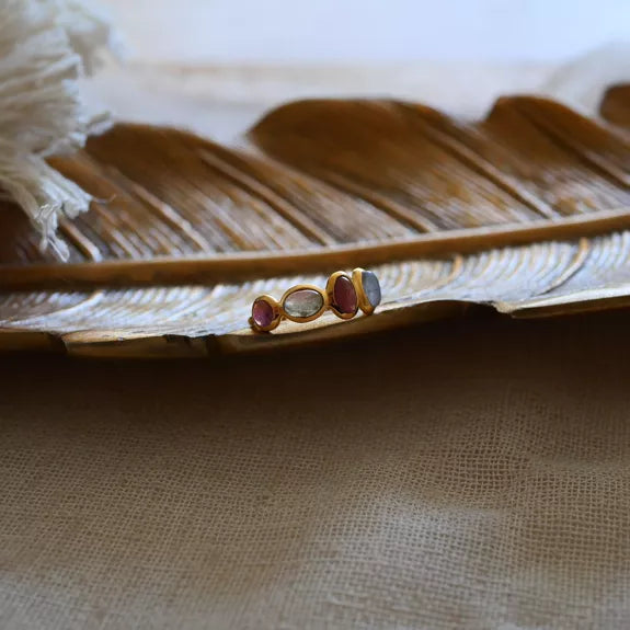 Bague réglable dorée à l'or fin 2 microns, ornée de Tourmaline rose et de Labradorite.